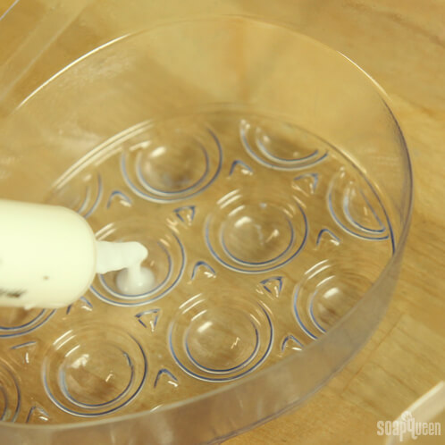 ONE: Cut and melt 2 oz. of Goats Milk Melt & Pour Base and heat in the microwave on 6 second bursts. Leave it uncolored. Using the Injector Tool, drop a small amount of white into the first divot of the mold. Spray with isopropyl alcohol to disperse bubbles and allow to dry for 10 – 15 minutes. NOTE: The Massage Egg Mold used in this project has been discontinued. It has been replaced with the 6 Bar Oval Silicone Mold.