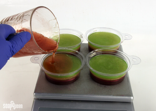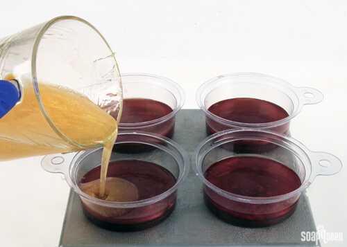 When making a layered melt and pour project, temperature and patience is key. When layers are poured too hot, the soap may melt the layer below. Pouring each layer no higher than 125 °F avoids this problem, and keeps each layer looking crisp and clean. It’s also important to wait for each layer to harden and form a thick skin before pouring the next layer.