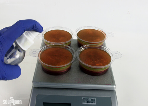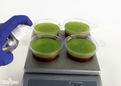Use a spoon to fully mix in the colors, and add more of each colorant to achieve the desired green color. Spritz the gold layer with alcohol. Once the green soap has reach 125 °F or below, pour .7 ounces into each mold. Spritz with alcohol to disperse any bubbles.
