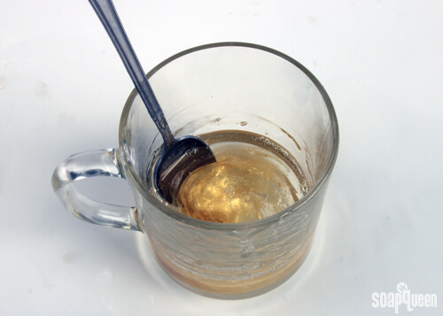 SEVEN: Allow the gold layer to cool and form a thick skin. To a clear cup of soap, add shavings of the Super Pearly White, Fizzy Lemonade Color Block and a very small amount of the powder Neon Blue Raspberry Colorant. If necessary, reheat the soap in the microwave using 3-5 second bursts. To easily incorporate the blue, spritz a couple squirts of rubbing alcohol into a spoon. Next, spoon out two mini scoops of the blue colorant into the small alcohol puddle until it is fully dissolved. Stir all of the blue into the soap, it should mix easily.