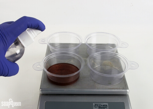 TWO: While the melt and pour is still fluid, pour even amounts into five small, heat safe containers. Each container will weight 3.2 oz.