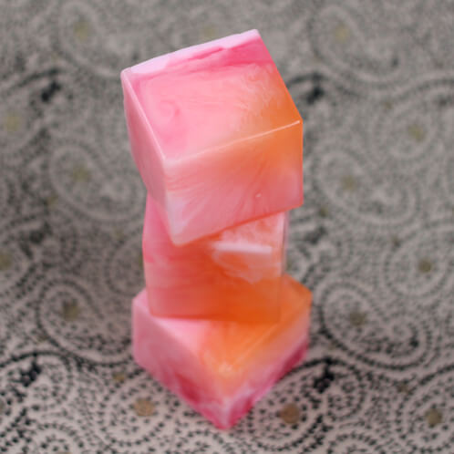 FIVE: Pour a little layer of orange soap into 6 cavities of the cube mold, about 1/8th inches thick. Next, a little of the clear pink soap on top of the orange soap. Try pouring each layer into a different corner of the cube cavity for more color variation in the final soap. Next, pour a little opaque pink soap on top of the pink and orange layers. Again, pour the soap into the opposite corner of the mold cavity to create color variation and swirl. Keep rotating soap pours until all six cavities are full.