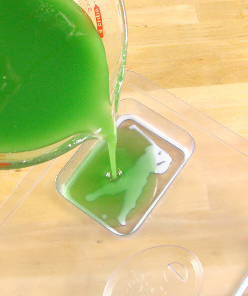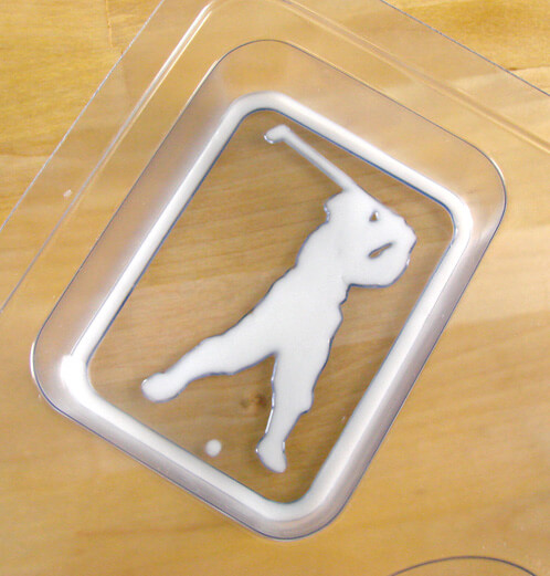 ONE:Melt 1 ounce of white soap base in a microwave safe container. Use a syringe to fill in the border and outline of the golfer. If you accidentally “color outside the lines”, no problem. Once the soap dries, use the mini spatula tool to clean the edges. NOTE: The Golfer Soap Mold has been discontinued. It has been replaced with the 12 Cavity Rectangle Silicone Mold.