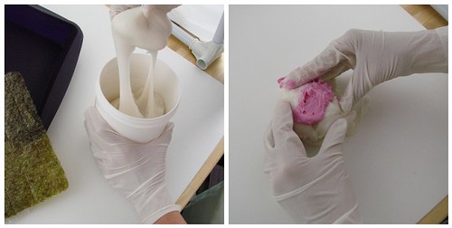 Tip: This product is mixed by hand and wearing gloves is required. We recommend vinyl gloves, as latex gloves tend to stick to the mold putty. The photo below is using latex gloves and it was a mess!