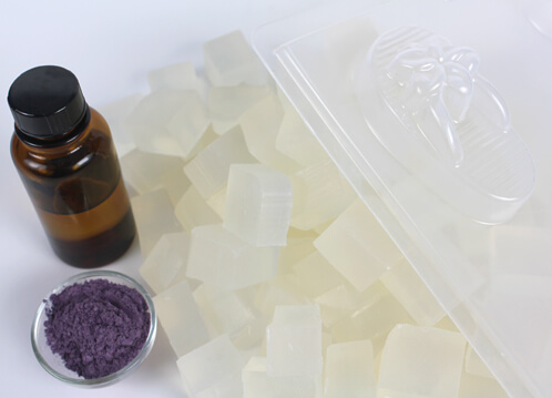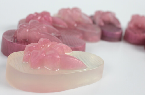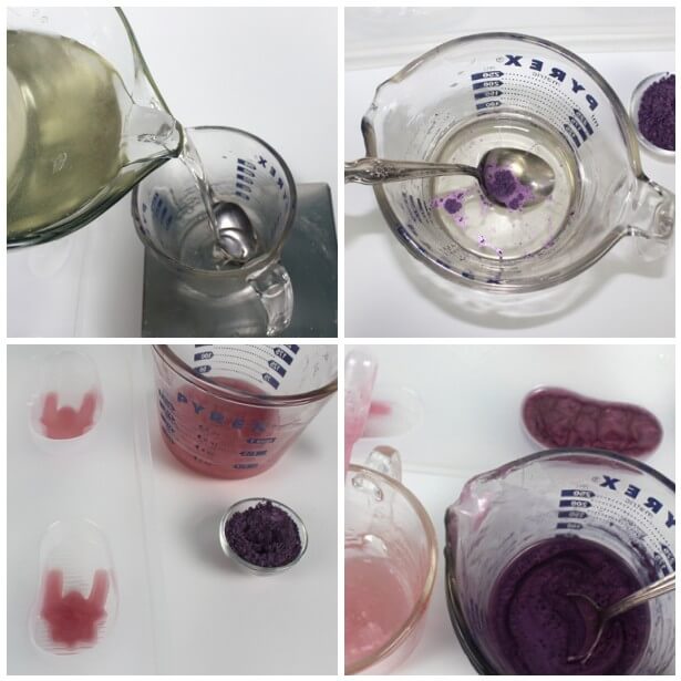 THREE: Spray the Flip Flop Mold with rubbing alcohol and use droppers to carefully squeeze the pink soap into the center flower of the mold. Let cool for 10-15 minutes.