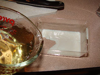 Step 1: Cut melt and pour soap into 1” cubes and put into microwave safe container (about 3 oz should be enough for one bar). Cover with saran wrap and microwave for 30 second intervals until soap is melted.