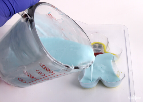 - Allow the small details to fully harden and cool. If necessary, reheat the four containers of soap using 5 second bursts until liquid. Once the soap has reached approximately 120-125 degrees, spray all mold cavities with 99% isopropyl or rubbing alcohol and pour each cavity with the various colors of soap. You will have one color left over, set remaining soap aside to use after the hardened soap have been removed.