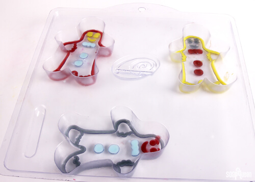 EIGHT: Using the injector tool, fill in the small details on the gingerbread men, including the lines around the edges, bow-tie, buttons and face. For each gingerbread men, use various colors to make three unique soaps.