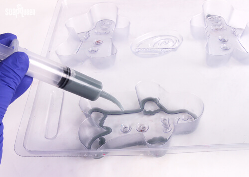 - Using the injector tool, fill in the small details on the gingerbread men, including the lines around the edges, bow-tie, buttons and face. For each gingerbread men, use various colors to make three unique soaps.TIP: When using the injector tool, have a cup of hot soapy water nearby! This allows you to quickly clear out the soap in the injector tool between colors. If you don’t, the soap may harden in the injector tool and clog it.