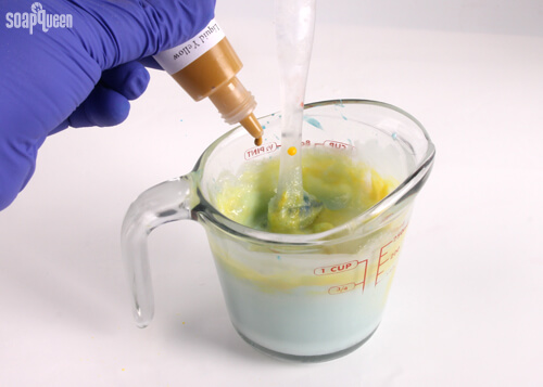 COLOR PREP: In a small container, add ten .15 CC mini scoops of Fizzy Lemonade Colorant and 1/2 tsp. liquid glycerin. Use a mini mixer to remove any clumps. In a separate container, disperse four .15 CC mini scoops of Neon Blue Raspberry into 1 tsp. of 99% isopropyl or rubbing alcohol. Use a mini mixer to remove any clumps, and set both colors aside.