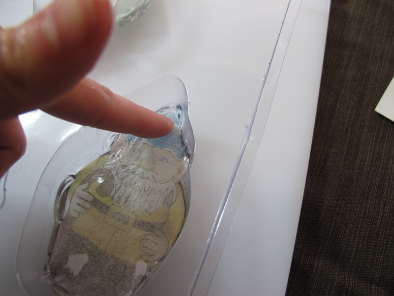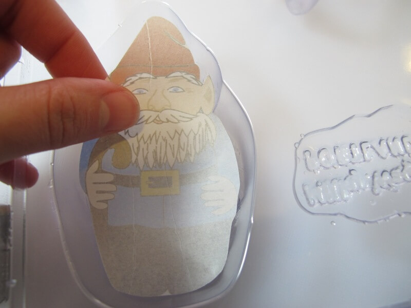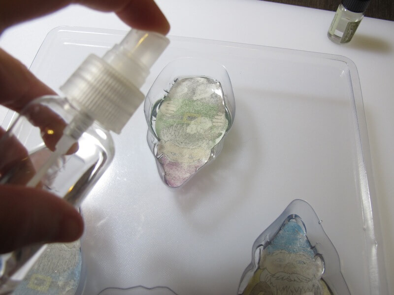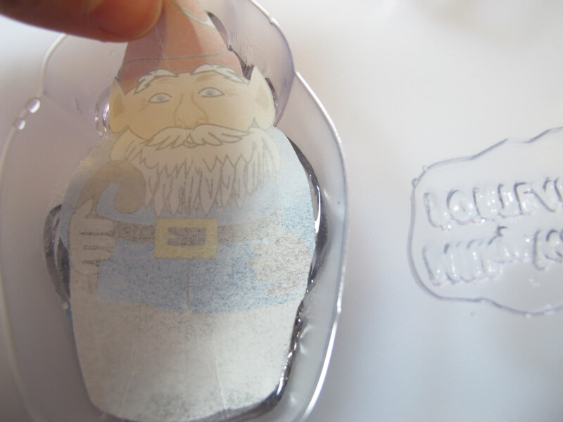 Spray with a light mist of alcohol to get rid of any bubbles.  Before we insert our gnome let the layer cool down a bit.  Gently blow on the soap and when a very slight skin forms it’s time to add the paper.  Lay the gnome face down over the clear soap.