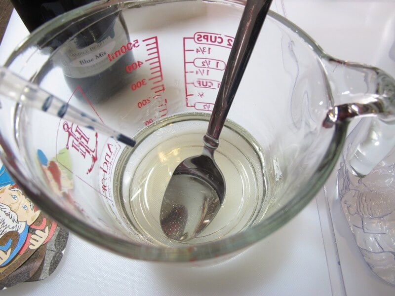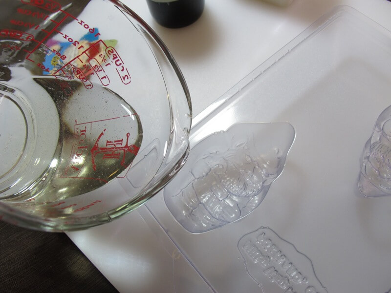 Now we’re ready to melt and pour our first layer.  For the first layer I like to use Clear Melt & Pour Soap Base.  Melt about 4 or 5 ounces on short bursts just until melted.  Don’t over heat.  I like to blue this a bit to help with clarity.  To do that I added a drop of Blue Mix Lab Color.  You can add scent to this layer or not.  Just be sure your fragrance doesn’t color the soap.