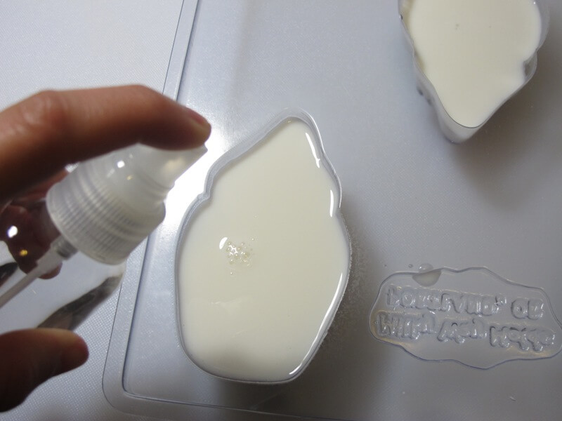 Add your fragrance.  Spray the little guys with alcohol to help with the layers sticking and pour your white base into each cavity.  Finish with a spray of alcohol to get rid of any bubbles.