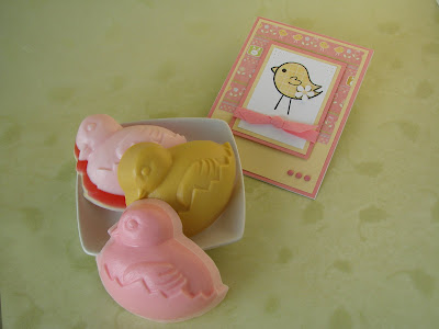These soaps were made with the Milky Way Chick’n’Egg mold, White Melt and Pour, Non-Bleeding Pink Liquid Color, Non-Bleeding Yellow Liquid color and Non-Bleeding Red Liquid Color.