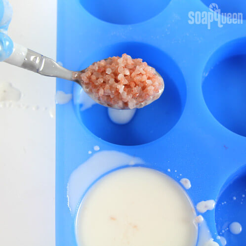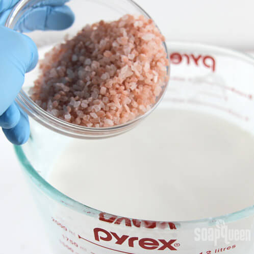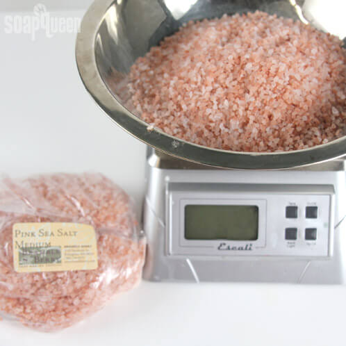 FOUR: Portion out the Medium Pink Himalayan Sea Salt and add it to the soap. The crystals will sink to the bottom of the soap. This is part of the design and is difficult to avoid because of the thin viscosity of the soap when melted versus the heavy grains of salt.