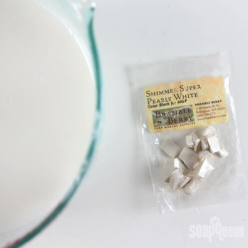 TWO: After the soap has been fully melted, shave off chunks of the Super Pearly White Color Block and stir vigorously to melt the color block into the soap. Since the soap is already white, the color block will add a slight shimmer to the soap.