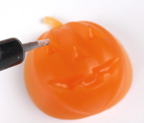 FIVE: Unmold the pumpkins. Reheat the black colored soap on 15 second bursts in the microwave. With the pumpkins face-up (he he!), spray with a light mist of rubbing alcohol. Use the injector tool and black soap to fill in the eyes, nose and mouth cavities of the pumpkin to create the jack-o-lantern face. Spray again with Rubbing Alcohol and allow to harden. Since this is melt and pour soap, it’s ready to use right away. Enjoy!