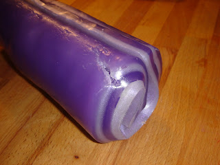 As I mentioned in this post (which included a video of the soap rolling), the layers for this Jelly Roll were too thick. You can see that my rolled soap cracked (yes, my head is hanging low in shame). Thankfully, the middle part of the oval roll was usable so all the soap was not lost.