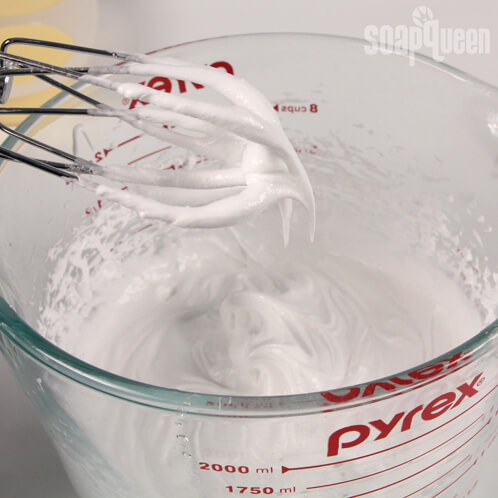 SEVEN: In a large bowl, combine 1.5 cups Foaming Bath Whip, 6 Tablespoons Meringue Powder and 1.5 tbsp Liquid Glycerin. Whip mixture with a hand mixer. Continue whipping until stiff peaks form.