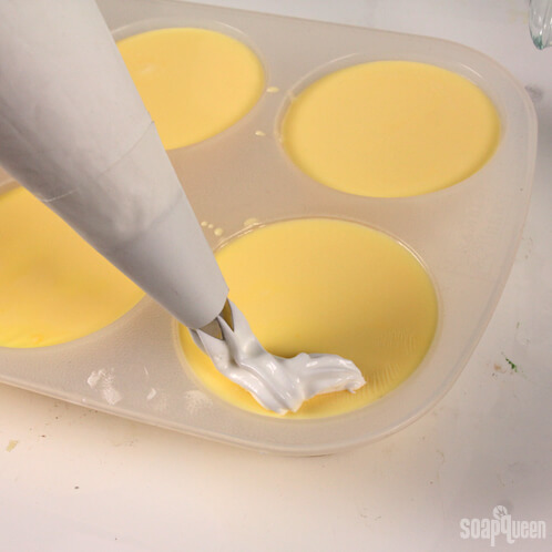 Also, I would recommend piping the cold process soap right onto the melt and pour itself. I wouldn’t recommend spraying the melt and pour base with alcohol first, as it may make the frosting separate. A small test batch would be really helpful.