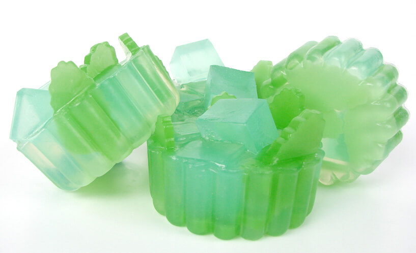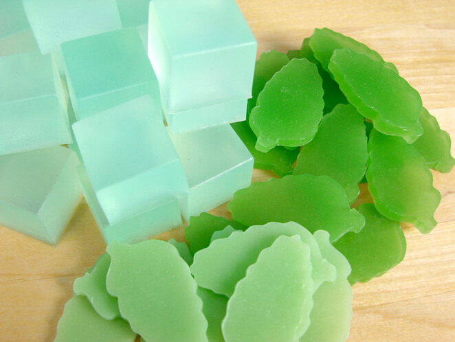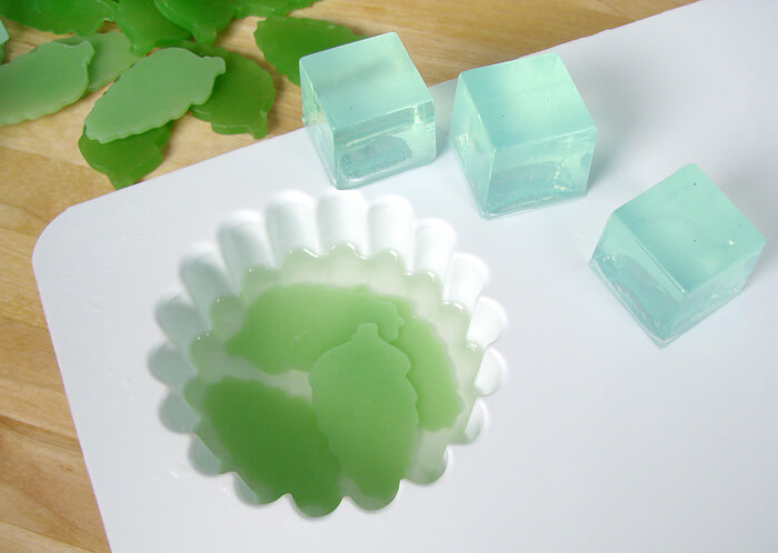 Mint Leaves: For my dark colored mint leaves, I used clear melt and pour mixed with Liquid Green Colorant and a sprinkle of Yellow Mica. Then I poured a thin layer into a brownie pan tray mold. Once it cooled, I used my mini leaf cookie cutter to cut out the leaves. Try adding a little bit of white soap base to the mix if you want a lighter mint color. As you can see, I did both!