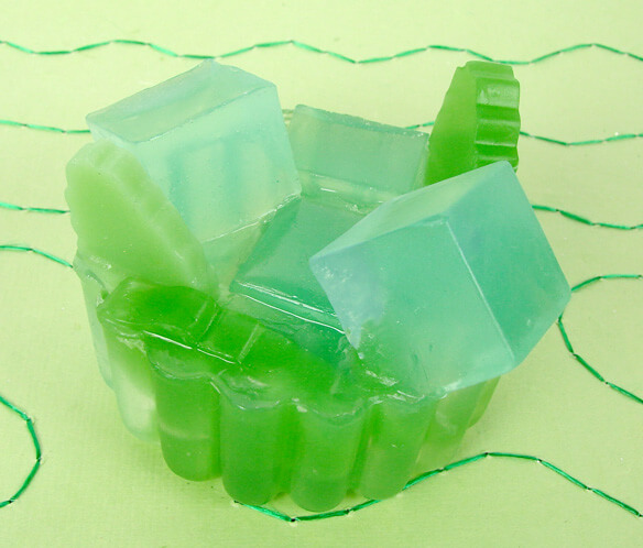Assembly: Pour a thin layer of clear melt and pour (that has cooled to 130 degrees) into your scalloped round soap mold. Spritz four mint leaves and add them to the soap base. Then add another thin layer of clear melt and pour. Spritz three or four ice cubes with rubbing alcohol and add them to the soap, on top of the mint leaves. Then start the random assembly. Add more mint leaves and ice cubes until the mold is full and you have mint and ice sticking out everywhere. Repeat with the other cavities and remember that they’re not all going to be the same. There are no two Mojito Soaps alike (in my experience).