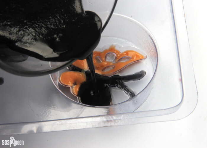 SIX: Allow the orange soap to cool and harden. Reheat the black soap in the microwave using 3-5 second bursts. Once the soap has melted but is no hotter than 130 ° F, spritz the orange layers with alcohol and carefully pour the black soap on top. Do not pour the soap if it is hotter than 130 ° F, as it could melt the layers below. Be careful to only pour the black soap into the butterfly design. Spritz with 99% isopropyl alcohol to get rid of any bubbles. Allow to fully cool and dry.