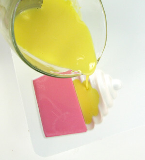 - Separate the scented soap evenly into two containers or mugs. Add the canary colorant to one container of soap and the cherry colorant to the other. Just a couple of drops of undiluted color will do the trick. Mix both well. (Note: The ELF Cupcake Mold has been discontinued. It has been substituted with the Round (cupcake) Silicone Mold. To create a two tone cupcake, make soap in the Round (cupcake) Silicone Mold then top it with the Foaming Bath Whip Frosting.)