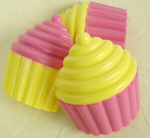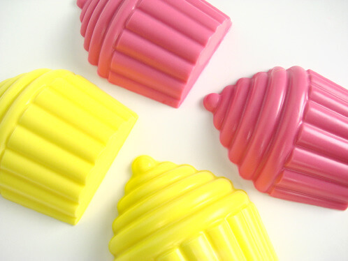 - Once the soaps have cooled, remove them from the mold and carefully cut off the frosting parts of each cupcake. Then cut the yellow frosting tops into small chunks and melt the soap back down in the microwave. Repeat with the pink soap.