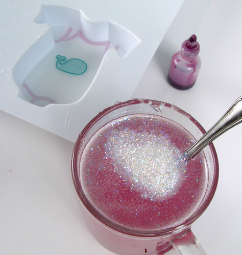 ONE: First fill in the seams with pink or blue colored soap (maybe even glitter) using a dropper. It should take about two to three minutes to cool.