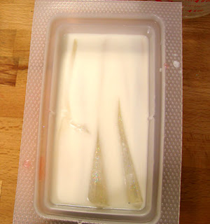 Pour the first layer. Allow it to harden with a thick skin. Depending on how hot you poured the soap, this may take 5 to 15 minutes. While you’re waiting, cut the glitter soap into long strips.