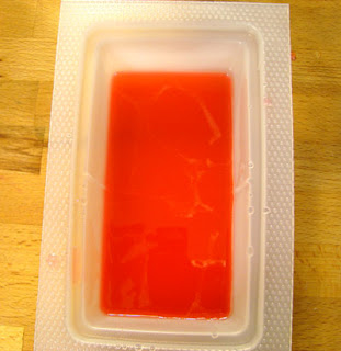 The first layer is made with clear soap and non-bleeding red. It’s important to use clear soap to get a true red. If you use white soap, the color will end up pink. Hint: if you use a yellowing fragrance (such as orange essential oil), your red color may end up orange. Choose your fragrance wisely.