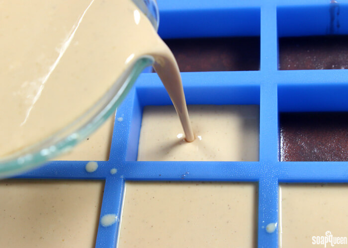 - Pour the brown soap evenly into all 12 cavities of the mold. Each cavity will receive about 1 oz. of soap. If it helps, weigh the first pour and eyeball the rest. After pouring, spray each cavity with rubbing alcohol to disperse any bubbles. Set aside to cool and harden.