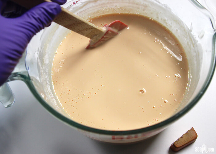 ONE: Chop and melt 12 oz. of the Clear Melt and Pour Base, and 1 oz. of the Goat Milk Melt and Pour Base in the microwave using 20 second bursts. A combination of bases is used to give a rich brown color, while still being slightly opaque. Once melted, add shavings of the Shimmer Cappuccino Color Block and stir until they have melted and the soap is a rich brown color. If necessary, place the soap back into the microwave using 10 second bursts to reheat.
