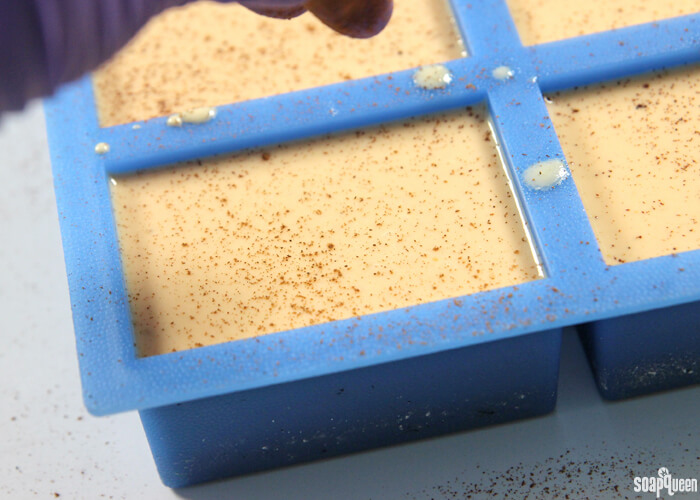 SEVEN: Immediately sprinkle the top of the soap with a fine dust of ground cinnamon. Allow to fully cool and harden, and enjoy! To avoid glycerin dew, wrap them immediately in plastic wrap, or another airtight packaging option.