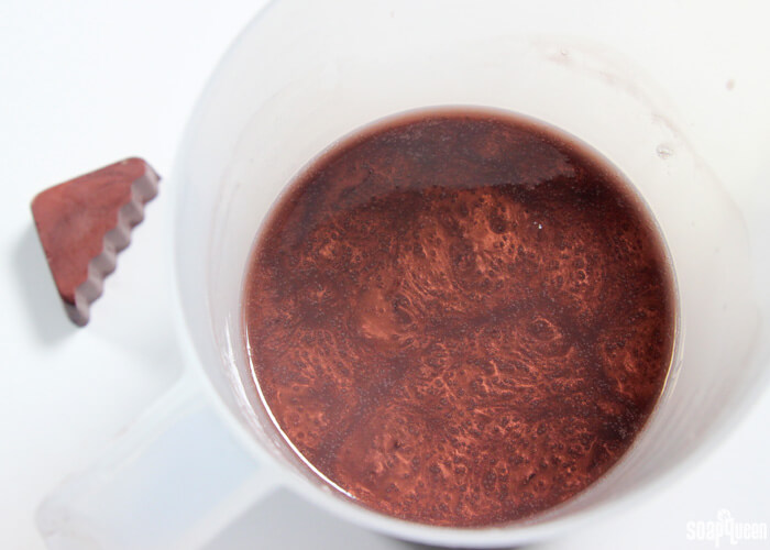 - Chop and melt 12 oz. of the Clear Melt and Pour Base, and 1 oz. of the Goat Milk Melt and Pour Base in the microwave using 20 second bursts. A combination of bases is used to give a rich brown color, while still being slightly opaque. Once melted, add shavings of the Shimmer Cappuccino Color Block and stir until they have melted and the soap is a rich brown color. If necessary, place the soap back into the microwave using 10 second bursts to reheat.