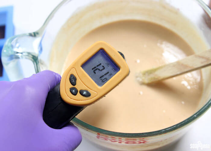 - Check the temperature of the orange soap. You want to make sure it is no hotter than 125 ° F. If it is too hot, the ground pumpkin seeds will not suspend and the soap may melt the dark brown layer below. Check to make sure the brown soap has cooled and developed a thick skin in order to support the orange soap. Spritz the brown layers with rubbing alcohol to help the orange soap stick, and gently pour the orange soap into each cavity. Spritz the soap with alcohol to disperse any bubbles.