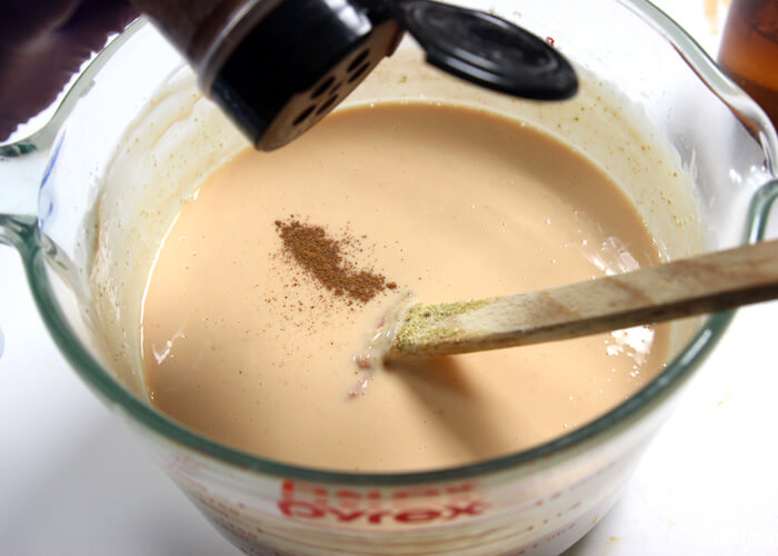 - Add three heaping tablespoons of ground pumpkin seeds and stir to combine and get rid of any large chunks. Then, add a few dashes of ground cinnamon. A little goes a long way; you want just enough so that you see a few speckles in the soap. If your skin is sensitive to cinnamon, feel free to leave this step out.