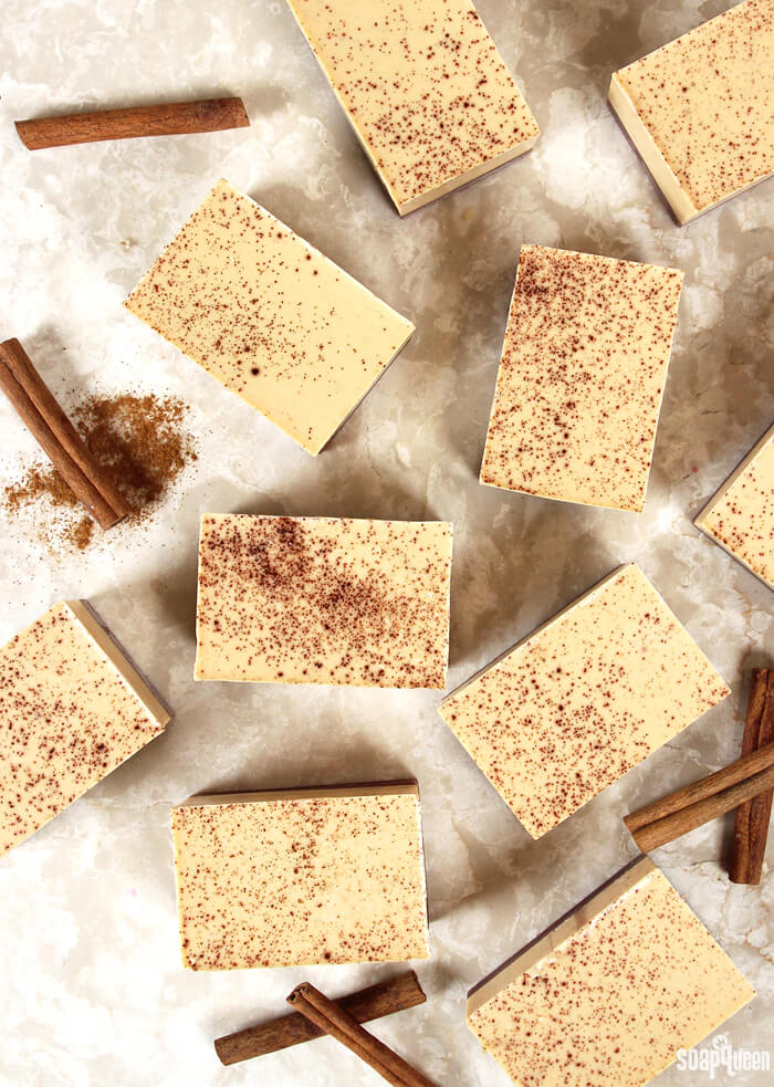 - Immediately sprinkle the top of the soap with a fine dust of ground cinnamon. Allow to fully cool and harden, and enjoy! To avoid glycerin dew, wrap them immediately in plastic wrap, or another airtight packaging option.