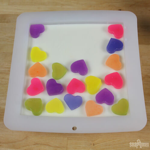 NINE: When the Goat Milk soap is firm to the touch, arrange your cut heart soaps on top. We randomly arranged ours but you can try a fun pattern!