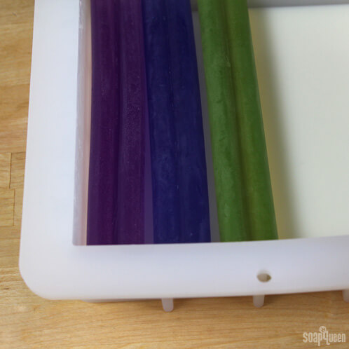 THREE: Each silicone heart mold will be used to create only one color of heart, so pour each color into its own single mold. If you are working with fewer than 6 molds, you can always wait 30 minutes for the soap to set-up, unmold, and then pour the next color. The silicone molds are watertight, but be sure to carefully snap the seal together. You wouldn’t want to end up with a soapy mess.