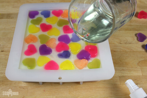 TEN: Cut 4 oz. of Clear Melt and Pour base. Melt it in a heat-safe container on 10 second bursts. Once it has cooled to 125°F, spray the hearts liberally with alcohol and then pour the melted soap over the hearts. Spray with isopropyl alcohol to disperse bubbles.