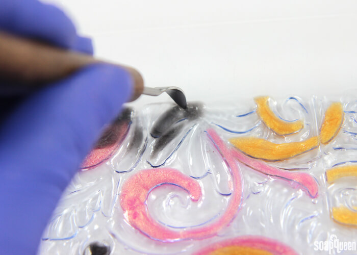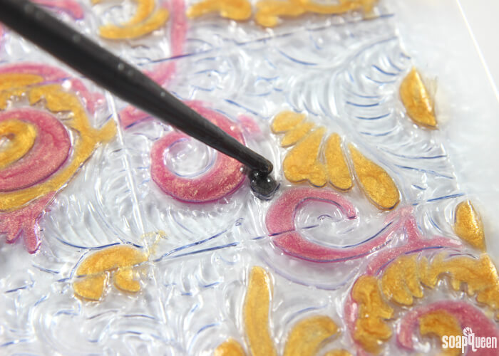 • Spritz the Tray Floral Wallpaper Mold with alcohol. Spraying the mold helps the soap easily spread into the design. Using a dropper or an injector tool, begin filling in the design with all three colors. There is no right or wrong way to fill in the design, so just have fun with it! Periodically spray the tray and freshly poured soap with rubbing alcohol to disperse any bubbles in the soap, and to help the soap spread throughout the design. To help make sure there was an even amount of each color in each bar, I alternated colors while filling in the tray. I concentrated on filling in the larger design elements with pink and gold, and used the black soap to accent and define. If the soap goes into an area where you did not intend, don’t fret! Allow the soap to harden and use a Clean Up Tool to scrape the soap out of the space. If necessary, place the soap back into the microwave using 5 second bursts to ensure it stays fluid and workable. You may also want to have a few extra droppers nearly; the soap can harden and cool in the droppers.
