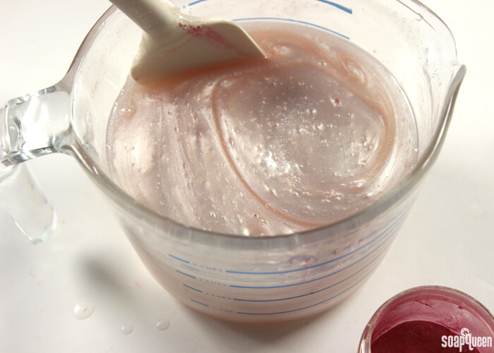 • Add 1 tsp. Super Pearly White and 1 tsp. Snowflake Sparkle Mica and use a spoon or spatula to thoroughly mix until there are no clumps. Add a pinch of Rose Gold Mica – just enough to add a light pink hue. Stir to mix in.