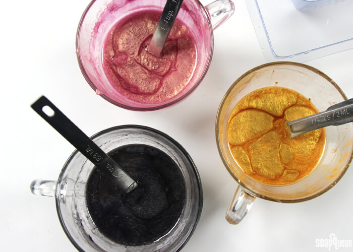 • Chop 6 oz. of Clear Melt and Pour Soap in small, even pieces. Put 2 oz. of soap into three separate heat safe containers and melt in the microwave using 10 second bursts. Once melted, quickly add 1/2 tsp. Luster Black Mica to one container, 1 tsp. Rose Gold Mica to another, and 1 tsp. King’s Gold Mica to the last. Use a spoon to thoroughly mix in the powders.
