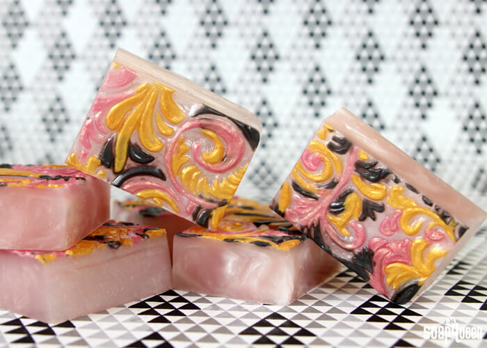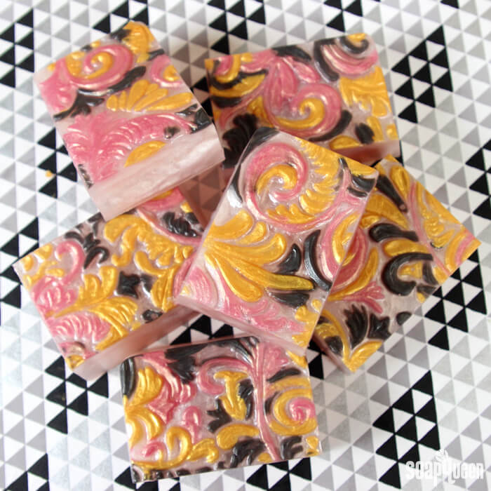 These Romantic Rose Gold Melt & Pour Bars really show off the individual micas. The details in the Tray Floral Wallpaper Mold are filled in with gold, black and pink colored soap. It provides contrast and creates a romantic color palette. The base is colored with a bit of Rose Gold Mica, which is a gorgeous mix of warm gold and dusty pink. Baby Rose Fragrance Oil is added to go with the romantic color palette. Use one of these bars to add some shimmer to your normal bath routine!
