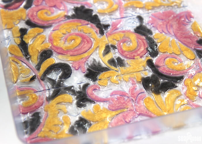 To help make sure there was an even amount of each color in each bar, I alternated colors while filling in the tray. I concentrated on filling in the larger design elements with pink and gold, and used the black soap to accent and define.