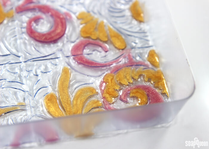 Finished detailingTHREE: Once the pattern is full, allow it to fully cool and harden Don’t wait too long though! Just a few minutes is all you need. If you want too long, the next layer will have a tough time adhering to the small details. Chop and melt 27 oz. of Clear Melt and Pour Base in a heat safe container using 30 second bursts. Once fully melted, add .5 oz. of Baby Rose Fragrance Oil and use a spoon or spatula to thoroughly mix in.