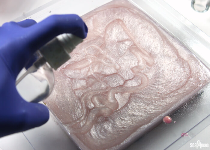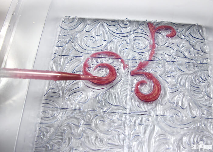 Colors mixed and ready to use!TWO: Spritz the Tray Floral Wallpaper Mold with alcohol. Spraying the mold helps the soap easily spread into the design. Using a dropper or an injector tool, begin filling in the design with all three colors. There is no right or wrong way to fill in the design, so just have fun with it! Periodically spray the tray and freshly poured soap with rubbing alcohol to disperse any bubbles in the soap, and to help the soap spread throughout the design.