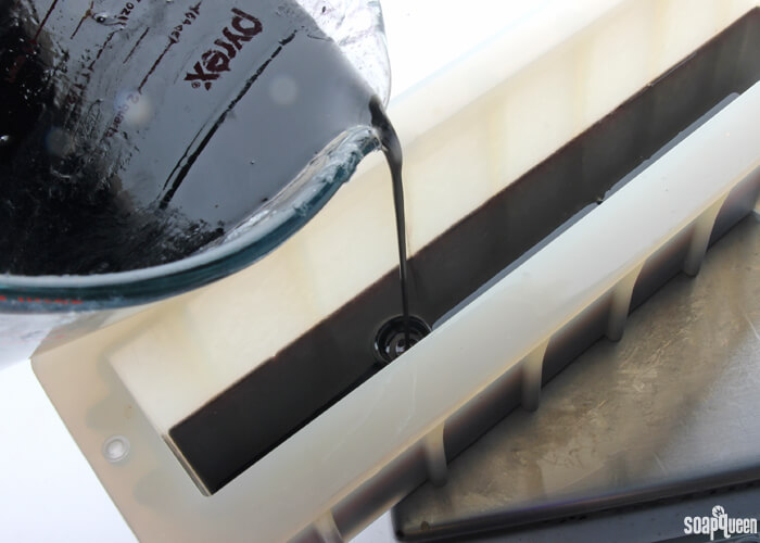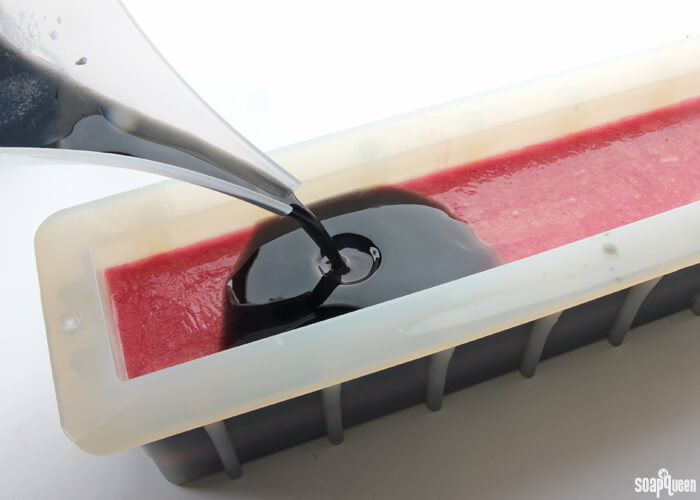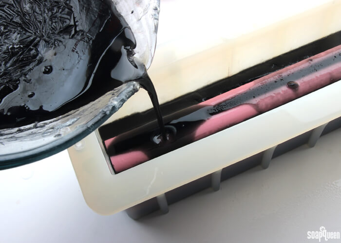 • Once the pink layer has hardened, spritz the pink layer with alcohol. Reheat the black soap if necessary and allow to cool to 130 ° F or below. Pour about 3 ounces of the black soap into the mold. Spritz with alcohol to disperse bubbles and allow to cool slightly. This will be the small amount of soap under the heart.